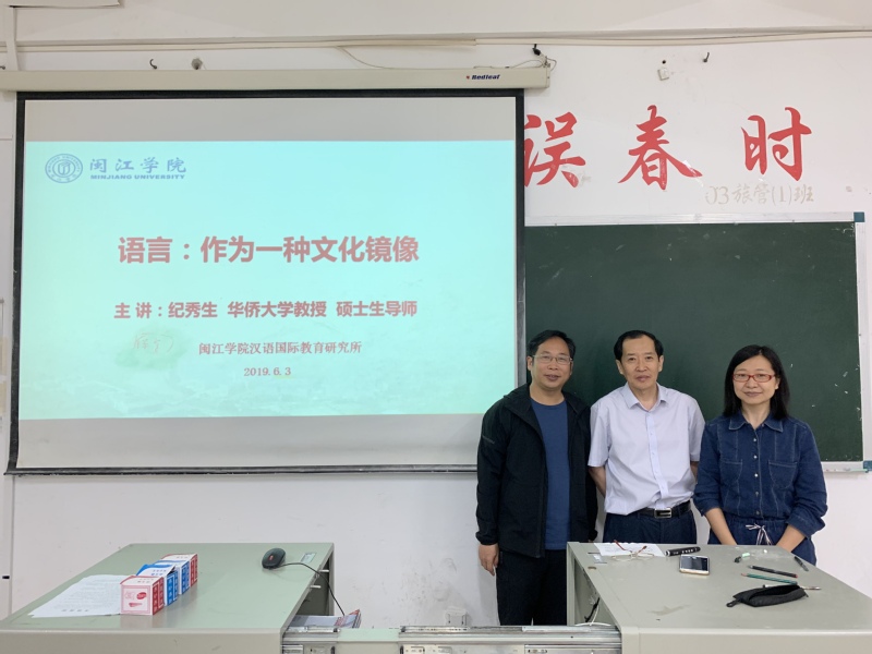 2019年6月3日,应我校汉语国际教育研究所之邀,中国华文教育基金会“华文教师完美远程培训”全球直播平台主讲专家、福建省语言学会副会长、华侨大学华文学院语言学及应用语言学硕士点负责人纪秀生教授莅校,为2018级汉语国际教育的学生们开设主题讲座——“语言:作为一种文化镜像”。讲座由李义海教授主持。