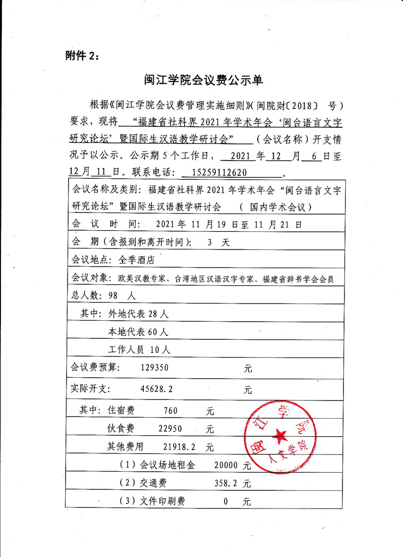 福建省社科界2021年学术年会“闽台语言文字研究论坛”暨国际生汉语教学研讨会 会议费公示单