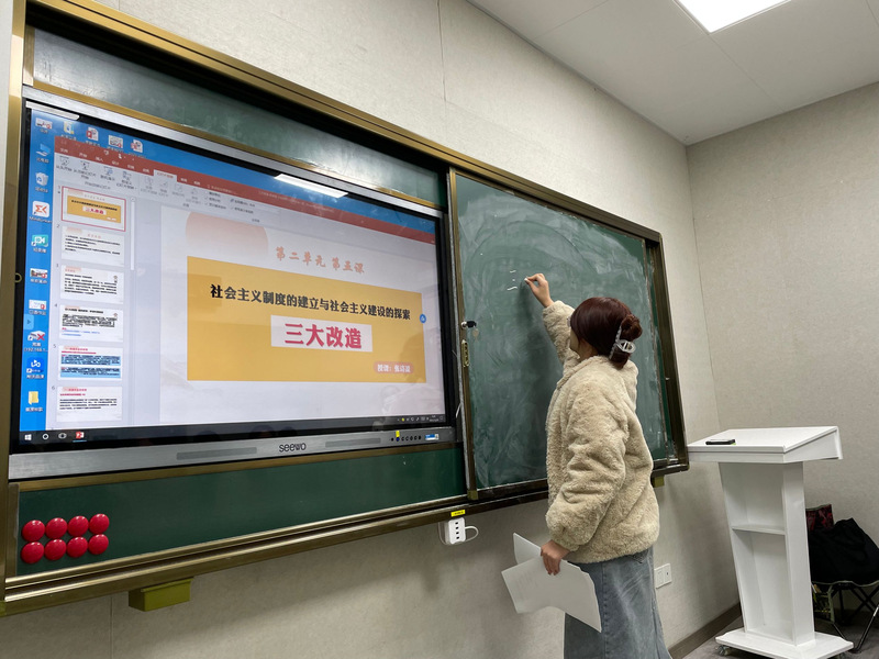 试讲活动分两个小组开展,分别就中学历史八年级下册的第五课《三大改造》与第六课《艰辛探索与建设成就》进行讲授。在试讲前,两组学生已分别与校外中学的指导教师对接,并在他们的指导下完成教案撰写修订以及PPT制作。试讲时指导老师分别针对学生们的仪表教态、讲课内容、师生互动、教材处理、课件设计、板书格式等方面提出了建设性的意见建议。学生们根据老师们的意见建议将在之后再总结再实践,为下学期的实习做好充分准备。