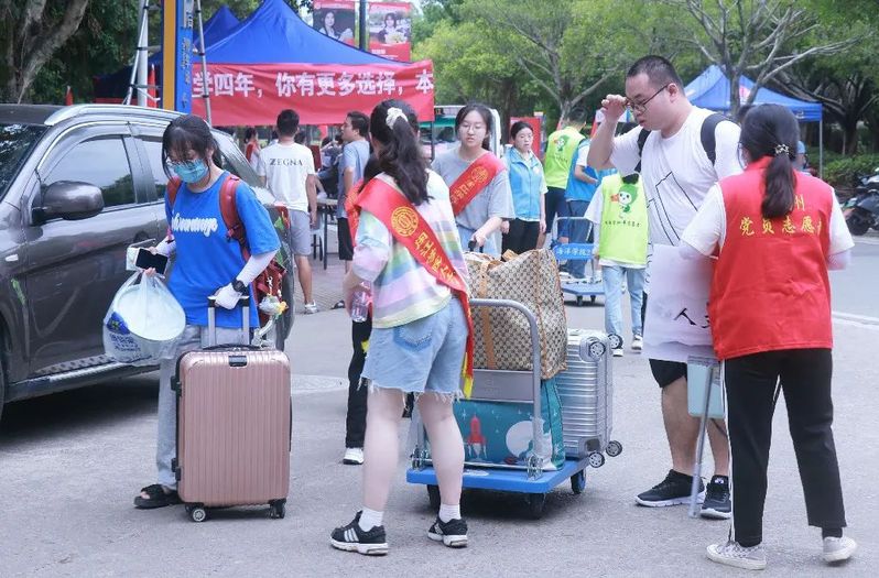 大本营,大本营里的党员志愿者为新生进行入学报道扫码登记,办理报到手续。随后,党员志愿者主动接过新生们的行李,引导新生前往宿舍。在志愿服务的过程中,他们热情地向新同学介绍校园环境,解答他们的疑问,迎新现场热闹而温馨。