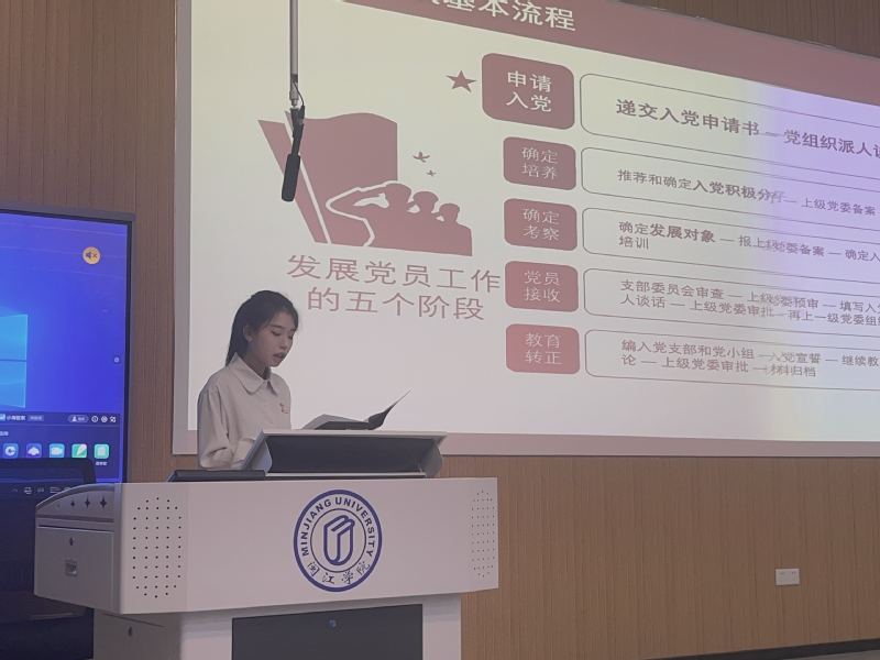 严把党员发展“入口关”。为规范党员发展工作,保障发展党员质量,69书吧 党建中心在开学第一周对学生党务负责人进行了“全覆盖”线下培训,并于9月9日举办了新生入党知识专项教育。由学生第二党支部负责人、党建中心培训部部长高梓青同学为大学新生讲述党的基层组织和普通党员奋斗、奉献、为民、爱民的真实故事,同时依据《中国共产党章程》和《中国共产党发展党员工作细则》等相关文件精神,对递交入党申请书、入党积极分子的确定和培养教育、预备党员的接收、教育、考察和转正等党员发展环节及要求进行详细讲解,引导新生积极向党组织靠拢,自觉争做中国特色社会主义的坚定信仰者和忠实实践者。