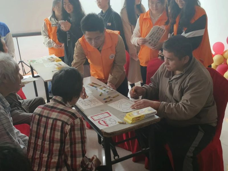 尾声渐近,一曲《歌唱祖国》拉下了文艺演出的帷幕。紧接着民俗协会的同学们开始与爷爷奶奶们画起了绘本。一张张精美的图画勾起了爷爷奶奶们年轻时的记忆,看到图上金黄的麦田和辛勤劳作的农民,有的爷爷讲述了自己年轻时在田野里劳作的场景;看到图上蜿蜒曲折的道路和沿途的风景,有的爷爷讲述了自己在山上养蜂的种种趣闻……志愿者认真倾听着老人们讲述的每一个细节,深深地感受到:他们虽然身体已不再年轻,但心里依旧充满活力。