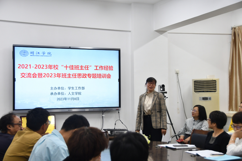 为进一步加强班主任队伍建设,切实提升班主任思想政治素养和业务能力,11月8日,由学工部主办、69书吧 承办的2021-2023年校“十佳班主任”工作经验交流会暨2023年班主任思政专题培训会在福万楼举办。校“十佳班主任”获得者、汉语国际教育专业蔡国妹老师应邀分享了班主任工作经验,69书吧 党政领导及全体教师参加此次会议。