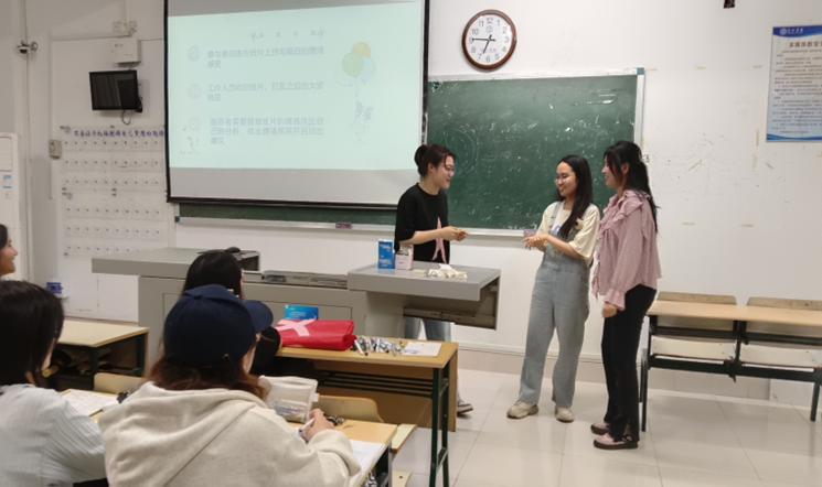 情感的抒发需要窗口,分享需要人倾听。同学们将最近生活感受写在准备好的纸片上,打乱后抽取并分析纸片上的情感信息。在活动过程中,现场观众依次上台抽取,认真解答情感疑惑,给予帮助。纸片成为了一个小小的心灵树洞,同学们在此倾诉情绪,通过对外表达的方式获取他人的建议,温暖心灵。