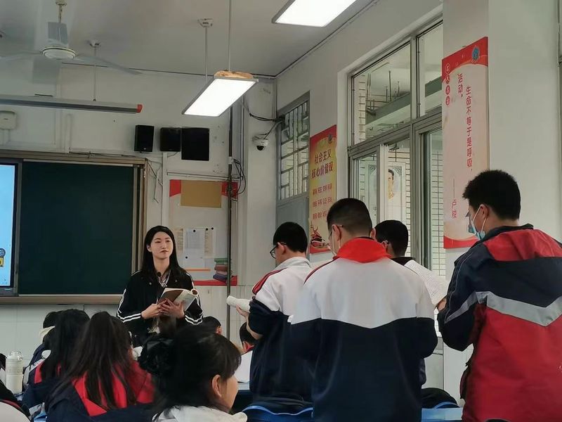 教师培养的是全面发展的人,文化教学也在教师的重要工作。实习生们积极协助指导老师进行校园文化节语文朗读活动的排练。选取诗词音乐、裁剪背景视频、安排学生走位……实习队员们实时跟进,在课间或午餐时间组织学生排练,与学生们也越来越默契。在教师与学生们的共同努力下,最后呈现出了丰富完整的文化节目。