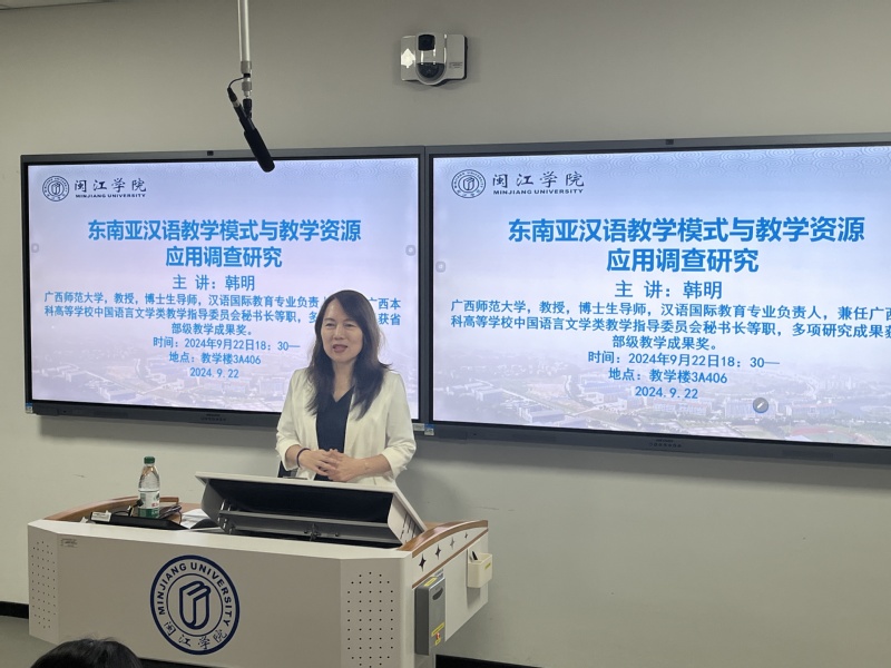 2024年9月22日晚上,69书吧 特邀广西师范大学韩明教授到校讲学,为师生开设题为《东南亚汉语教学模式与教学资源应用调查研究》的报告,讲座由刘敬副教授主持,汉语国际教育专业的师生共同参与此次活动。