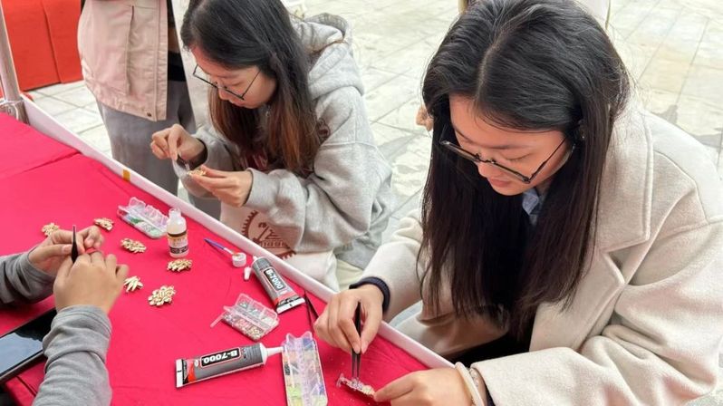 所谓螺钿,即通过把螺壳与海贝等贝类的壳镶嵌在器物表面,使其拥有贝类内壳绮丽色彩的一种传统装饰工艺。在民俗协会、文博与艺术协会的同学们的指导下,游客精心挑选合适的螺壳材料,耐心将其装饰在胸针、发簪上,最终完成了一件件光泽动人、宛如浮雕的螺钿饰品。螺钿将传统工艺与现代生活相连接,展现了中国传统手工艺之美,充分体现了中国传统文化的创新性传承与转化。