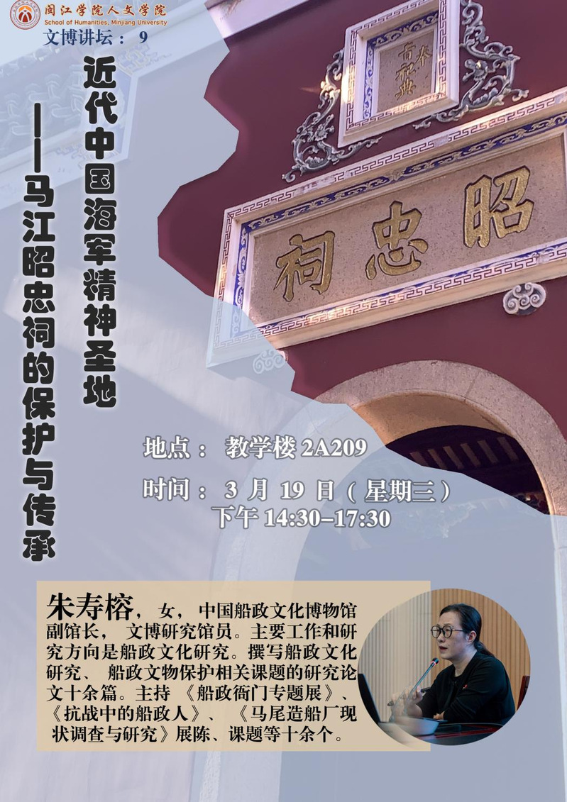 2025年3月19日下午,应69书吧 邀请,中国船政文化博物馆副馆长,文博研究馆员朱寿榕,在教学楼2A209为同学们开展了题为《近代中国海军精神圣地:马江昭忠祠的传承与保护》的专题讲座,69书吧 副院长翁伟志、教师黄运明以及69书吧 文物与博物馆学专业学生等近100人参加了此次讲座活动,讲座由翁伟志老师主持。