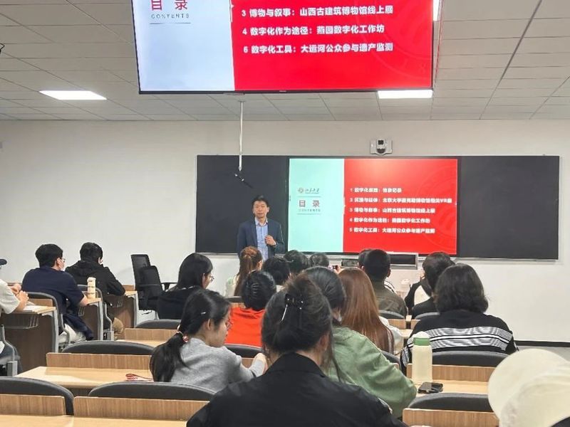 随着时代的进步,测绘的技术手段也在不断更新,先进技术以三维激光扫描仪为代表,通过反弹发射的激光束来确定方位,形成三维点云,用外业扫描+内业数据处理的方式,最后将其连接完成测绘。当今新方法则是以无人机和摄影建模软件为代表,同时用到摄影建模技术、虚拟教学技术以及虚拟教育资源库。张老师介绍,北京大学赛克勒博物馆相关VR展运用先进的技术使现实与虚拟相结合,让人们能够切身体会在实地实景的感觉,收获了很好的反响。之后张老师又分享,以甲午海战为主题的《寻找致远舰》的展览策划,创新性地用实体沙盘“凝固”还原了甲午海战的时刻,并用数字化方式演示舰船海战的动态过程,给予参观者真实感,并提升他们的观展体验。通过对这两个展览的介绍,张老师用浅显易懂的方式让同学们明白了数字化在文化遗产保护及宣传方面的重要性。