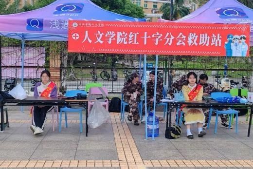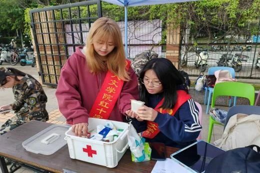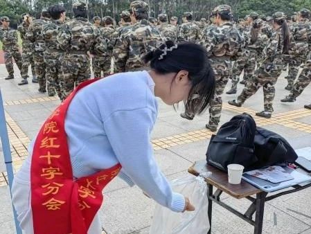 志愿者们密切关注训练场学生身体状况,救助站全天候为同学们提供藿香正气液、葡萄糖补剂、云南白药喷雾、创可贴等军训必备应急药品,为身体突发不适的同学提供相关应急医疗援助,保证本次参训人员的身体健康。