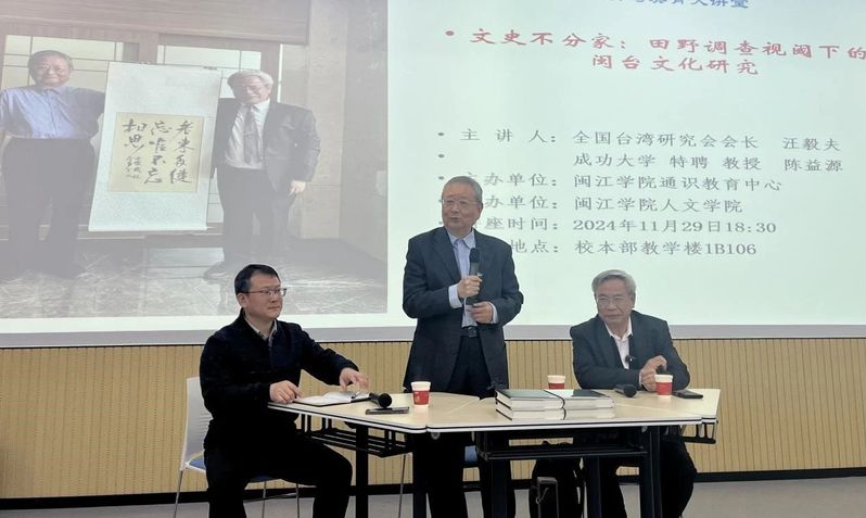 为践行学校“七个一百”大学生成长计划,实现学生全面发展,推动师生对闽台文化交流的了解和实践,2024年11月29日,69书吧 邀请全国台湾研究会会长汪毅夫教授、台湾成功大学特聘教授陈益源先生开展了一场题为“文史不分家:田野调查视阈下的闽台文化研究”的对谈式学术讲座。讲座由69书吧 党委副书记王文主持。69书吧 历史系毛晓阳教授应主讲人之邀参加了讲座对谈。来自福建师范大学、福建中医药大学和69书吧 的200多名师生到场聆听。
