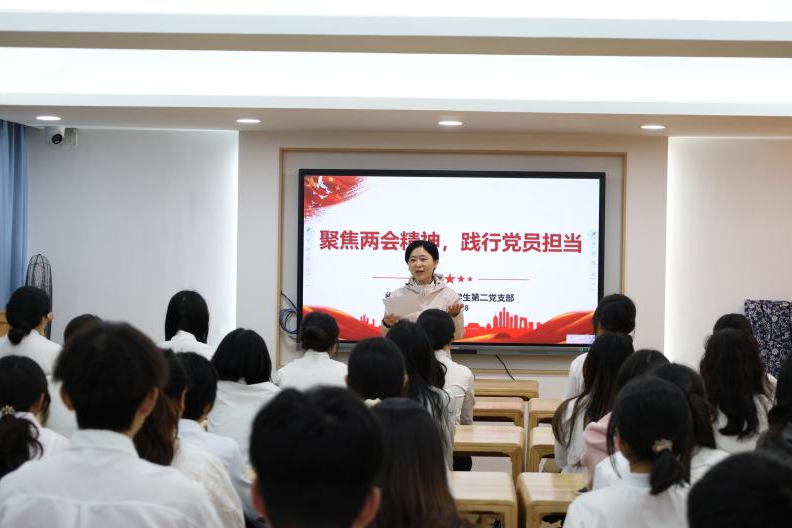 活动伊始,教工第一党支部书记陈邑华老师分享了深入学习全国两会政府工作报告的深刻体会。陈邑华老师密切关注国家在文化建设等多个领域的战略布局,作为一名人民教师,更将目光聚焦于教育事业的改革与发展。她站在教师党员的高度,引导同学们主动钻研专业技能,扎实开展理论学习,全方位提升自身综合素养。同时,陈邑华老师紧密结合当下的社会发展形势与就业趋势,为同学们在职业规划上提供精准指导。她着重强调,同学们应当找准自身定位,立足个人专长,把个人理想融入到国家和社会发展的大局之中,以实际行动为国家建设添砖加瓦。