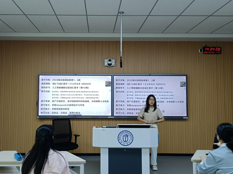 叶鑫琼老师的《汉字教学》课程,结合教学目标与学情,巧妙运用了深度学习技术和 deepseek 小游戏,为学生打造了趣味与知识兼具的汉字学习体验。陈贵秀老师的《词汇与词汇教学》课程涵盖语言整合、教学技能、数字素养、教学思政等多维度的教学目标,采用了讲授法、实践法、案例分析法相结合的教学方式,通过开发和运用deepseek 小游戏,让学生积极参与到词汇学习中,充分展现了数智技术在专业课程教学中的深度融入。胡百慧老师则以《唐代全国制瓷业格局》课程为例,借助高清地图资源,将抽象的制瓷业格局生动地展现在学生眼前,引导学生深入探究。