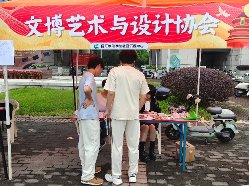 文博艺术与设计协会设置的多个互动项目精彩纷呈,看图猜历史人物考验知识储备,“emoji猜猜猜”趣味十足,文化遗产知识竞赛激发求知热情。历史文化协会摊位处,同学们围聚在三国人物卡片前,时而凝神辨认,时而热烈讨论,分享英雄故事。溯光话剧社的看图片猜台词活动,经典画面重现,观众们争相抢答,在台词的回忆杀里重温戏剧魅力。