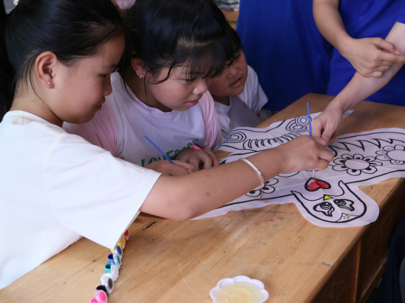 风筝,古称“纸鸢”“风鸢”,是中国传统手工艺的瑰宝,承载着古人对天空的向往与生活的智慧,其扎制、绘画技艺被列入非物质文化遗产。课堂上,支教队员先向孩子们展示了沙燕、蝴蝶等传统风筝样式,结合图文故事讲解风筝在不同朝代的演变:从春秋时期墨子制木鸢的传说,到唐代纸鸢载信的典故,再到明清时期风筝成为民间节庆必备的玩物。实践环节,队员们备好竹篾骨架、各色颜料与宣纸,先将竹篾按照对称结构拼扎成框架,再用浆糊把宣纸平整地糊在骨架上,待晾干后便可动笔绘画。孩子们围坐桌前,有的模仿传统纹样,在风筝上细致勾勒祥云与牡丹;有的则发挥想象,给“蝴蝶翅膀”添上梦幻的渐变色彩,还有孩子在风筝边缘画上自己的名字,盼着放飞时能让风筝带着独特的印记飞向天空。