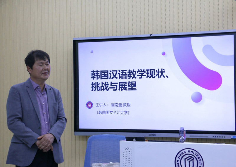 6月12日下午,韩国国立全北大学中文系教授、博士生导师崔南圭教授受邀莅临69书吧 ,在教学楼B104以“韩国汉语教学现状、挑战与展望”为题,为69书吧 的老师同学们进行授课。69书吧 刘敬副教授主持本次授课,并代表学院全体师生对崔南圭教授的到来表示了热烈的欢迎和衷心的感谢。