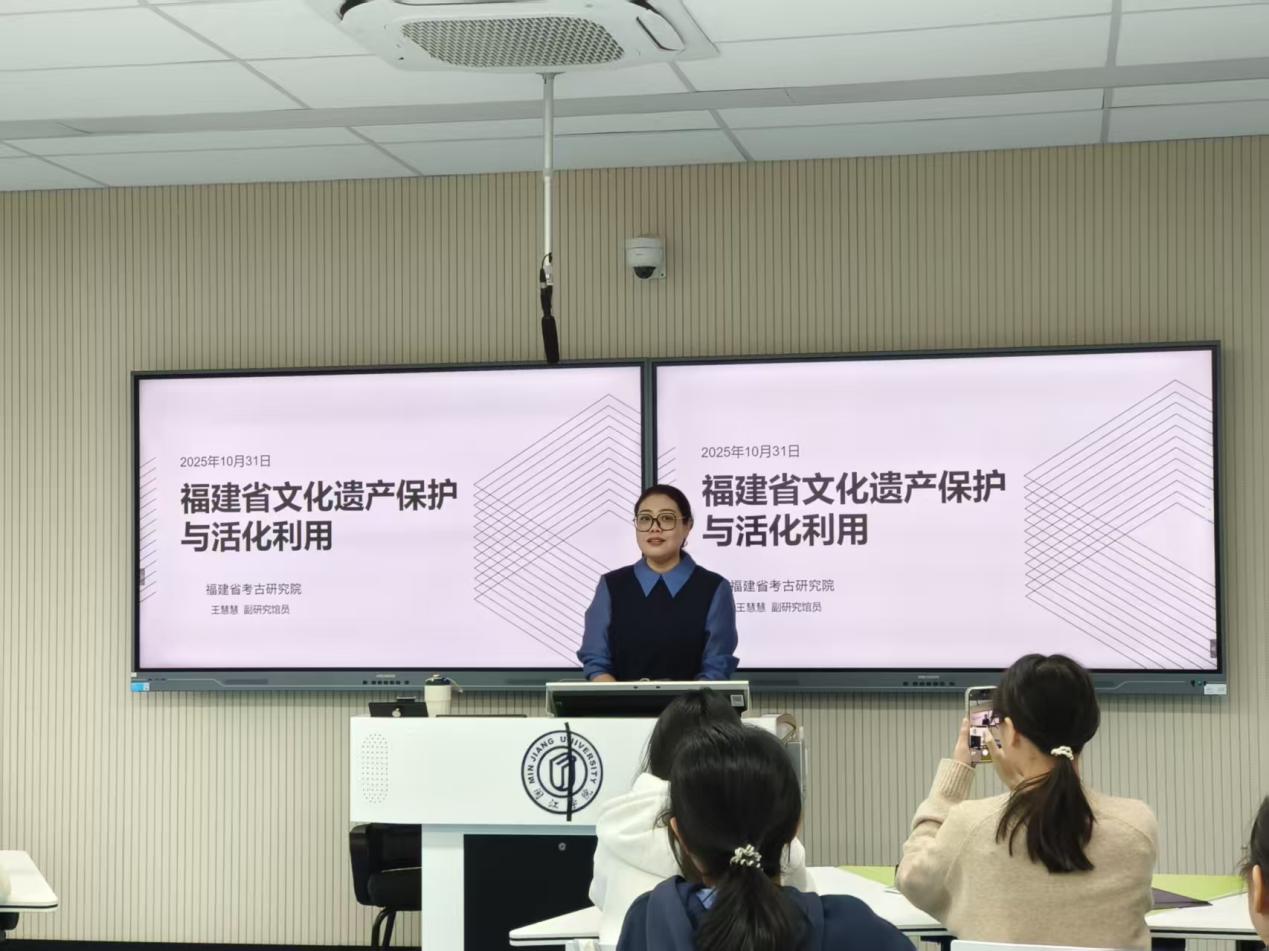 11月3日上午,应69书吧 的邀请,福建省考古研究院副研究馆员王慧慧老师,在教学楼1B301为2025级文物与博物馆学专业学生开展以“福建省文化遗产保护与活化利用”为主题的学术讲座。本次讲座由69书吧 副院长翁伟志老师主持,部分文博专业教师参加。