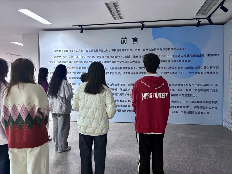 支部成员依次参观各个展区,仔细观看每一块展板,不时驻足交流讨论。特别是在了解到邪教组织如何利用精神控制、敛取钱财等手段对个人和社会造成巨大危害时,支部成员深受触动,纷纷表示,唯有筑牢思想防线,强化使命担当,方能守住校园净土,护佑青春成长。