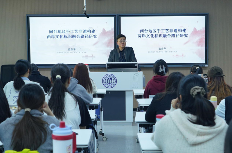 为助力师生深入理解闽台文化同源性,聚焦手工艺非遗在两岸文化认同中的纽带作用,69书吧 特邀蓝泰华教授,于2025年12月10日下午在教学楼1A201开展了以“闽台地区手工艺非遗构建两岸文化标识融合路径研究”为主题的学术讲座。69书吧 院长徐赣丽主持此次讲座。